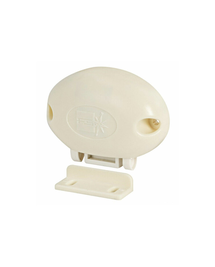 Pour fermer on appuie sur le bouton qui reste à ras, pour ouvrir on appuie sur le bouton qui ressort et débloque les portes prenant ainsi la forme d’un pommeau. Se monte avec 2 vis et une bague de l’extérieur avec un trou Ø mm 26. Corps en nylon, ressorts en inox.