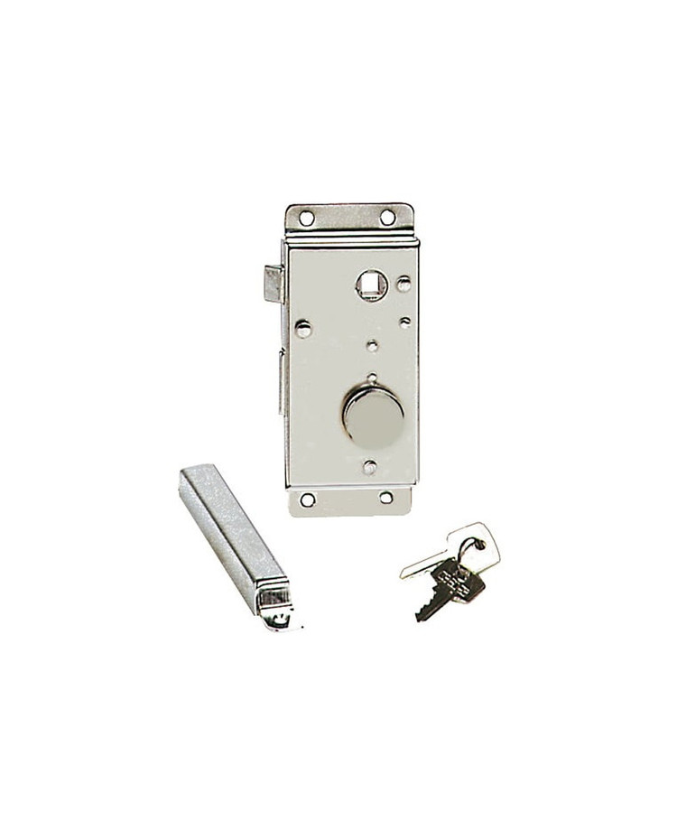 Version à plaquer en laiton chromé pour portes d’entrée, poignée et cylindre de l’extérieur, pommeau moleté à l’intérieur. Serrure très pratique et solide, avec butée.