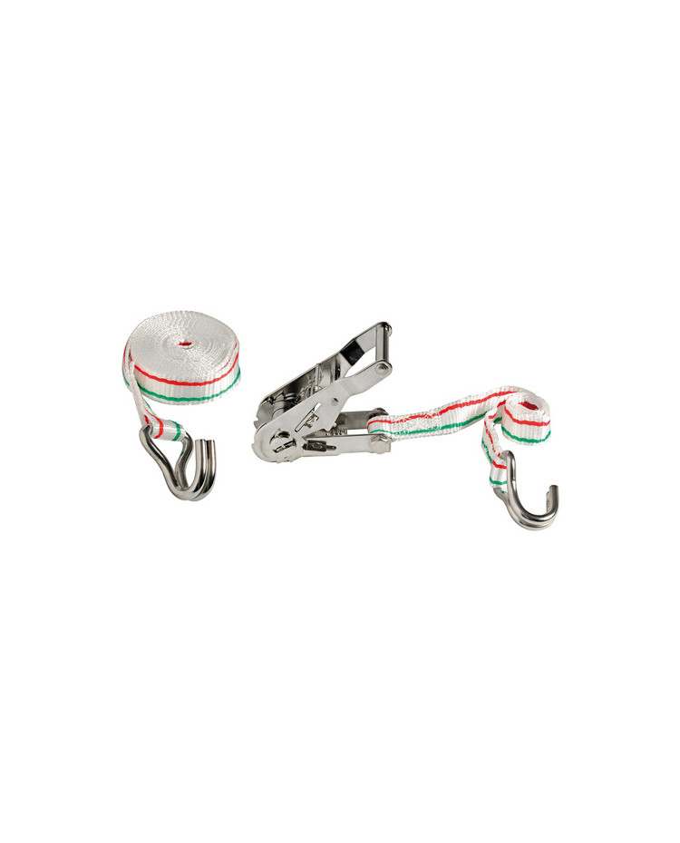 Le cliquet et les crochets de fixation sont en inox poli et la sangle est en polyester résistant aux UV.