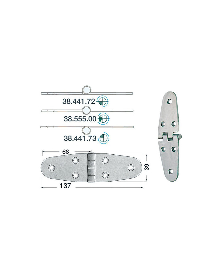 38.555.00 Charnière inox 2 mm - 137 x 39 mm - noeud à moitié encastré