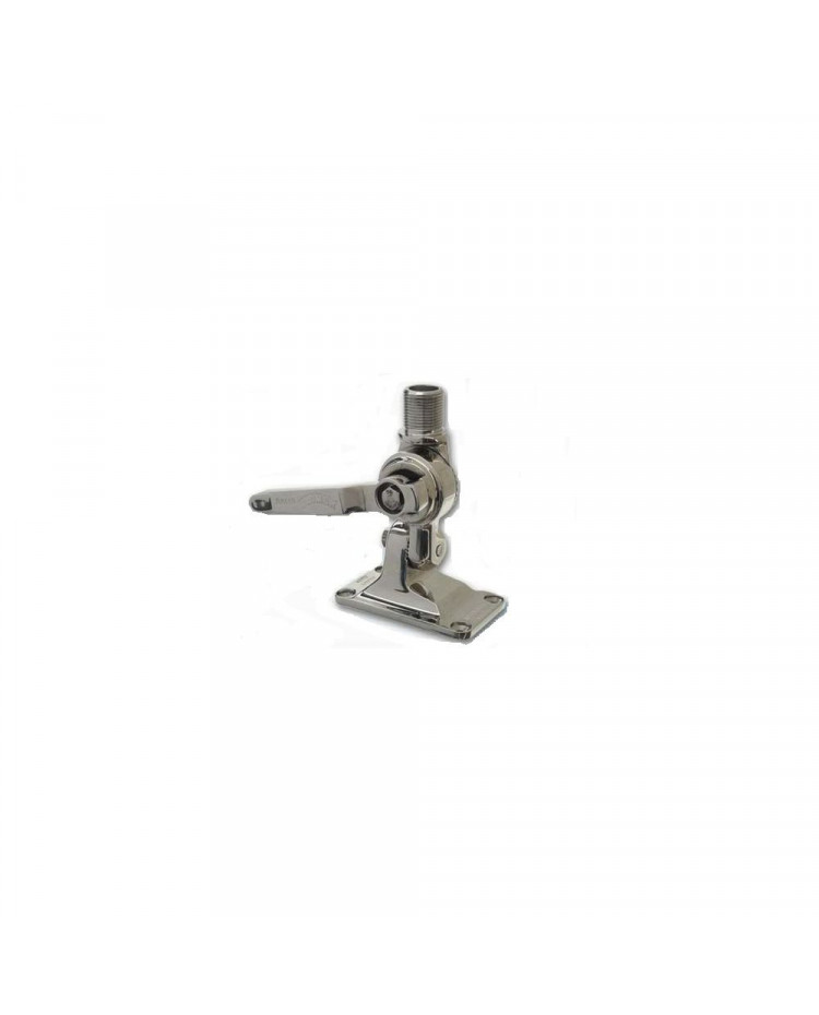 Support double articulation en acier inoxydable poli, pour fixation sur pont ou cloison, avec blocage par levier. Passecâble pour câble coaxial et GPS. Filetage standard 1"x14.