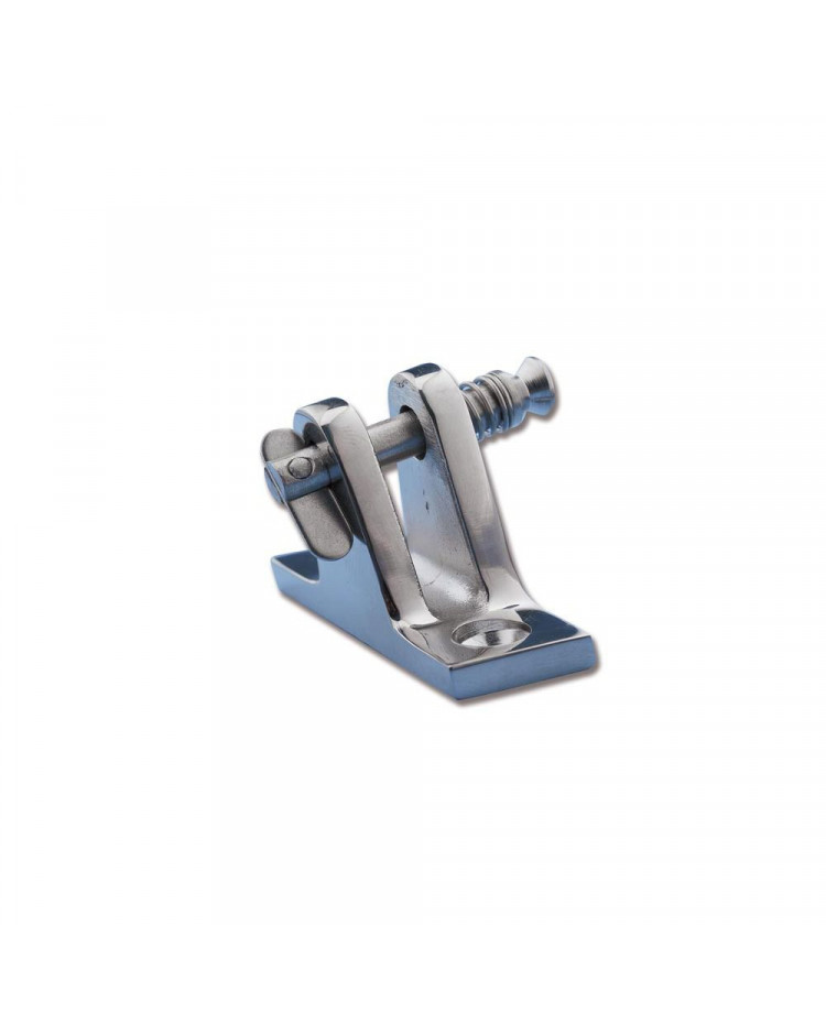 Platine inox pour fixation de bimini. Platine inclinée pour articulation avec axe ouvrable. Dimensions de la platine (mm): 20x56 Entraxe : 40mm Diamètre de l'axe: 6mm Ecartement des pattes: 7-8mm
