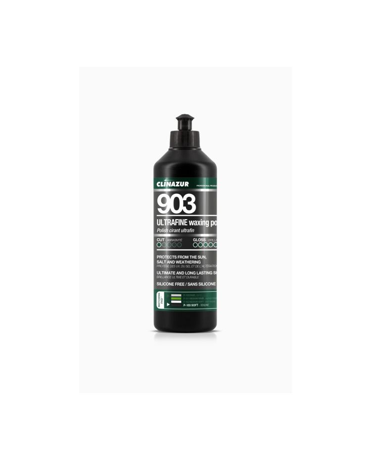 Le Clinazur 903 est notre pâte à polir super fine enrichie en cire spécifique haute résistance. 903 élimine également les micro-défauts. Il scelle les peintures et gelcoats pour une protection longue durée réduisant et retardant l'apparition des dépôts. Pour de meilleurs résultats, utilisez le tampon en mousse souple P103 ou une microfibre.