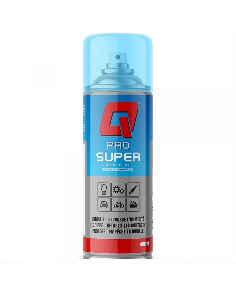 Q-Pro dégrippe, lubrifie, chasse l'humidité et protège. C'est un lubrifiant haute performance avec 50% d'agent lubrifiant de plus que les concurrents, et possède des propriétés de dispersion de l'eau supérieures aux autres produits. Q-Pro est sans silicone. Il s'utilise dans l'industrie, en atelier automobile, bateau, moto, vélo, réparation électrique et pour le bricolage à la maison.