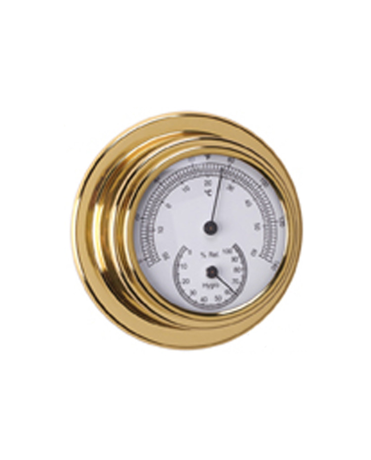 Thermomètre hygromètre Tempo. Boitier en tôle moulée polie miroir, dorée et émaillée....