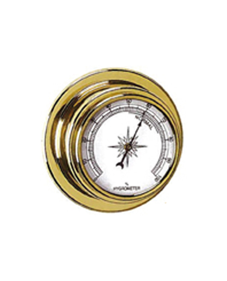 Thermomètre hygromètre Tempo. Boitier en tôle moulée polie miroir, dorée et émaillée....