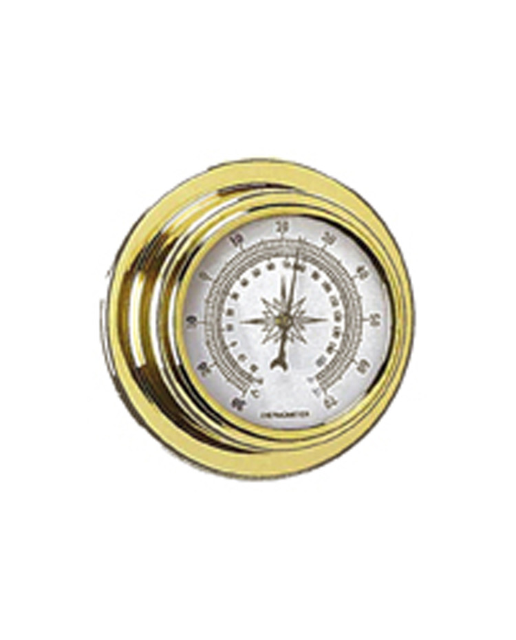 Thermomètre hygromètre Tempo. Boitier en tôle moulée polie miroir, dorée et émaillée....