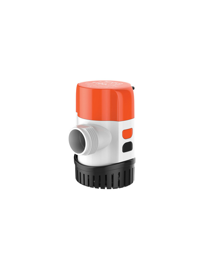 Pompe de cale automatique submersible avec clapet anti-retour et capteurs qui testent la présence d'eau toutes les 2,5 minutes pendant environ 0,5 seconde : si de l'eau est présente, la pompe détectera une résistance et continuera à fonctionner jusqu'à ce que toute l'eau soit éliminée.