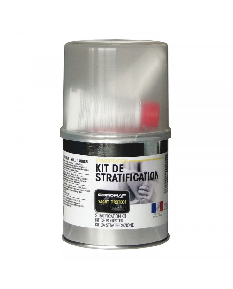 Le kit de stratification contient : 250 g de résine polyester, 5 g de catalyseur et 1 bande de taffetas 1.10 m x 9 cm.