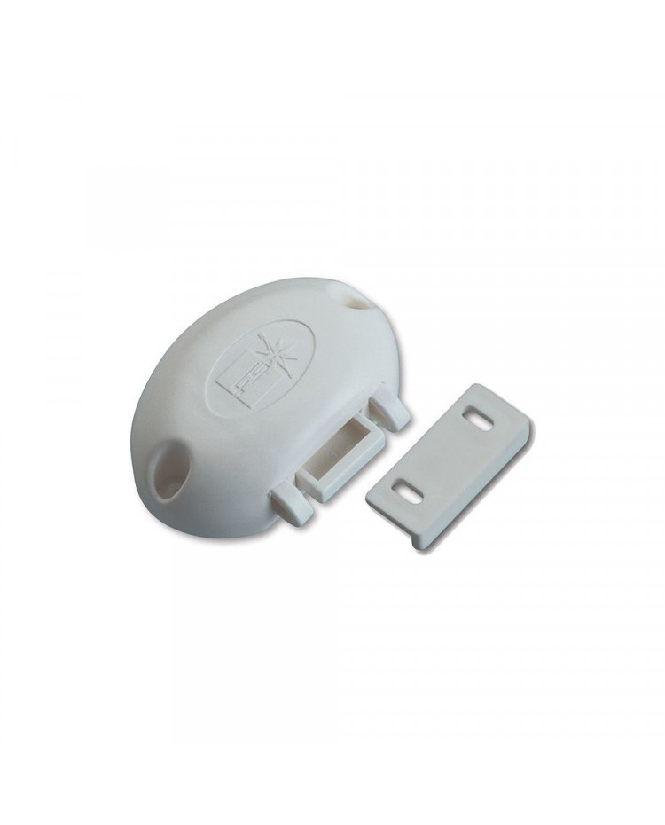 Serrure en plastique blanc anti-vibrations pour trappes et tiroirs.