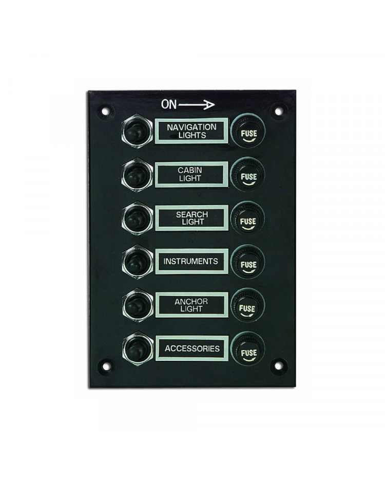 Tableau électrique étanche 6 interrupteurs. En bakélite noire avec interrupteurs en laiton. Porte fusible et 10 étiquettes en Anglais.